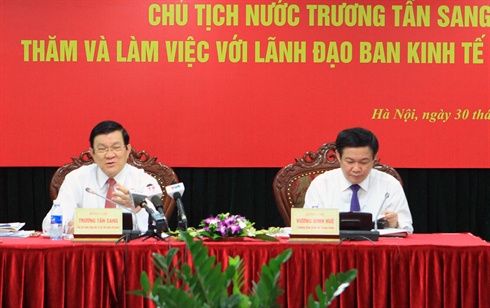 Le chef de l’État lui a demandé de continuer d'approfondir les problèmes chauds de l’économie : dettes publiques, créances douteuses, immobilier, efficacité de l'emploi des fonds… Il a également mentionné les problèmes difficiles : la compétitivité faible des produits vietnamiens, des coûts de production élevés, l’application des sciences et des technologies encore trop modeste… Ces problèmes nécessitent des études approfondies de la Commission de l’économie du CC du PCV afin de mieux contribuer au processus de changement de modèle de croissance et de restructuration de l'économie nationale.