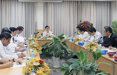 | Le président de la République, Truong Tân Sang (centre), travaille le 12 octobre dans la zone industrielle de Long Duc, district de Long Thành, province méridionale de Dông Nai. |