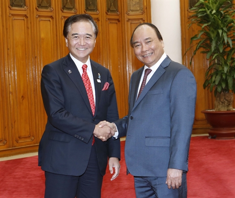 | Le Premier ministre Nguyên Xuân Phuc (droite) et le gouverneur de la préfecture de Kanagawa, Yuji Kuroiwa, le 14 juillet à Hanoï. |