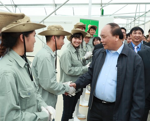 | Nguyên Xuân Phuc (droite) serre la main d’un ouvrier de la Compagnie d’investissement et de développement de l’agriculture high-tech de Hà Nam, le 2 février à Hà Nam |