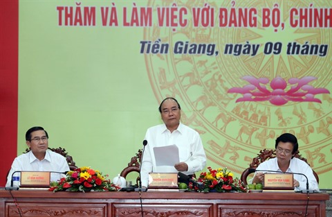 | Le Premier ministre Nguyên Xuân Phuc (centre) lors d'une séance de travail avec les autorités de Tiên Giang jeudi 9 août. |