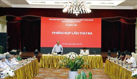 | Le Premier ministre Nguyên Xuân Phuc lors de la 3e réunion de l’équipe de rédaction du sous-comité sur l’économie et la société du XIIIe Congrès national du Parti. |