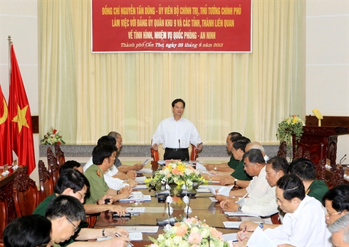 | Le Premier ministre Nguyên Tân Dung (centre) lors de la séance de travail avec le Comité du Parti du commandement de la 9e Région militaire, le 23 août à Cân Tho. |