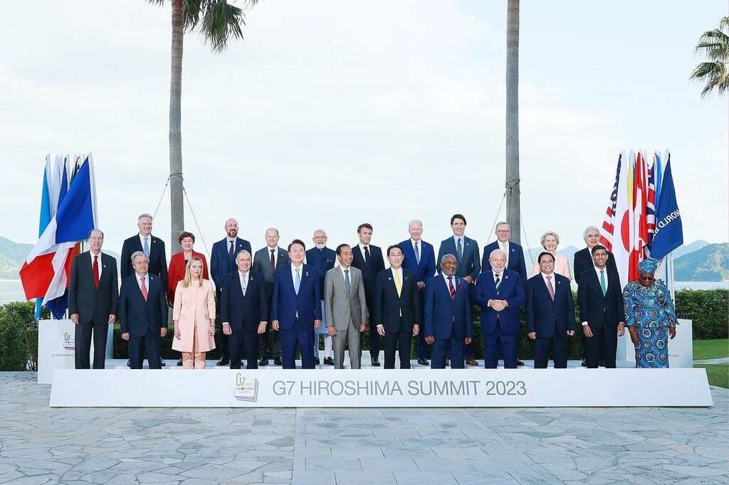 | Le Premier ministre vietnamien Pham Minh Chinh (1er rang, 3e à droite) et les autres dirigeants participant au Sommet du G7 à Hiroshima, au Japon. |