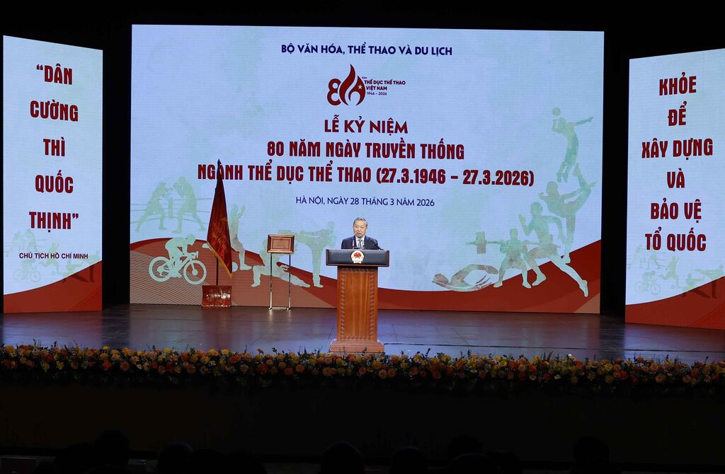 | Le secrétaire général du Parti, Tô Lâm, prononce un discours lors de la cérémonie marquant le 80ᵉ anniversaire de la Journée traditionnelle du sport vietnamien, le 28 mars à Hanoï. |