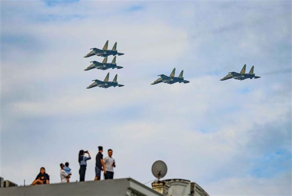 | Des chasseurs Su-30MK2 en démonstration dans le ciel de Hanoï. |