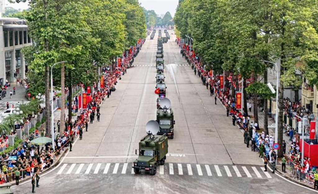 | Défilé de véhicules militaires et d’artillerie sur l’avenue Hùng Vuong, à Hanoï. |