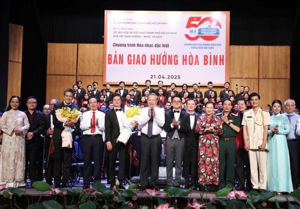 | Le secrétaire général du Parti, Tô Lâm et les artistes, le 21 avril au soir à l'Opéra de Hô Chi Minh-Ville. |
