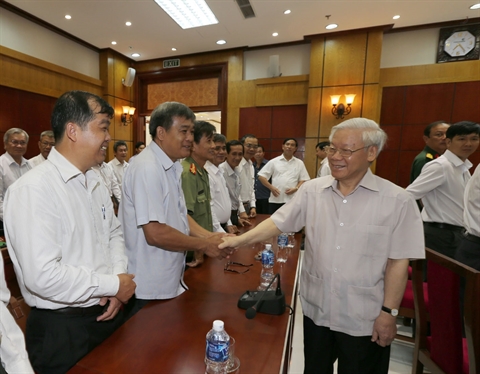 | Le secrétaire général du Parti, Nguyên Phu Trong (droite) et les responsables de Tây Ninh. |