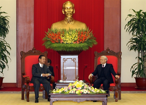 | Le secrétaire général du Parti communiste du Vietnam, Nguyên Phu Trong (droite), a reçu le 20 décembre à Hanoi le vice-Premier ministre lao, Somsavath Lengsavath |