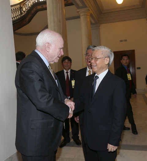 | Le secrétaire général Nguyên Phu Trong (droite) et le sénateur américain John MacCain, le 8 juillet à Washington. |