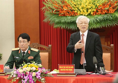 | Le secrétaire général du Parti communiste et président du Vietnam, Nguyên Phu Trong (debout), prend le parole lors d'une rencontre tenue le 19 décembre à Hanoï.  Photo : Phuong Hoa/VNA/CVN              |