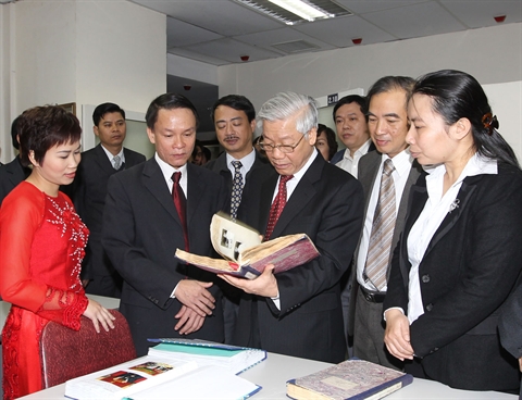| Le secrétaire général du PCV, Nguyên Phu Trong (aux lunettes), lors d'une visite à l'Agence Vietnamienne d'Information en 2012 |