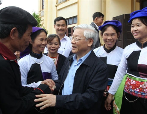 | Le secrétaire général du PCV, Nguyên Phu Trong (centre), rencontre des habitants de la commune de Vo Miêu, district de Thanh Son, le 5 avril à Phu Tho (Nord). |