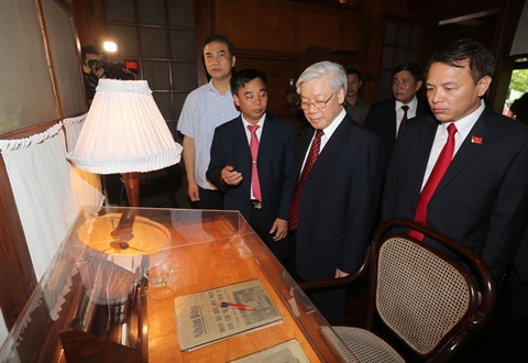 | Le chef du PCV, Nguyên Phu Trong (aux lunettes), visite la demeure et le bureau du Président Hô Chi Minh. |