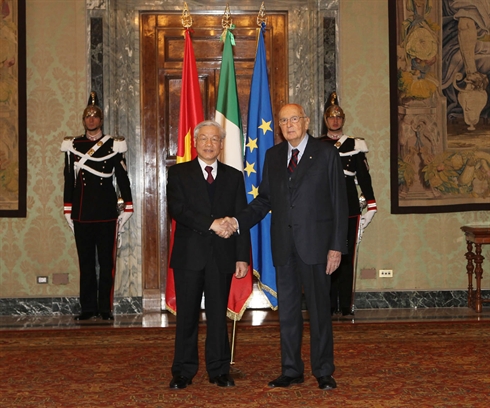| Rencontre entre le président italien Giorgio Napolitano (droite) et le secrétaire général du PCV, Nguyên Phu Trong, le 21 janvier à Rome. Photo : Trí Dung/VNA/CVN |