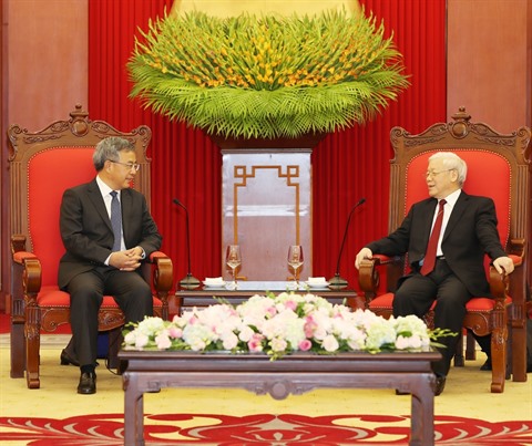 | Le secrétaire général du Parti communiste vietnamien Nguyên Phu Trong (droite) et le vice-Premier ministre chinois Hu Chunhua. |