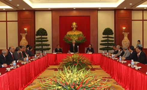 | Le secrétaire général PCV, Nguyên Phu Trong (centre) reçoit les chefs des délégations des partis politiques participant à la 19e réunion de l’ICAPP, le 25 avril à Hanoi. |