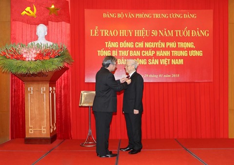 | Remise d'insigne pour les 50 ans d’adhésion au PCV du secrétaire général Nguyên Phu Trong (droite), le 29 janvier à Hanoï. |