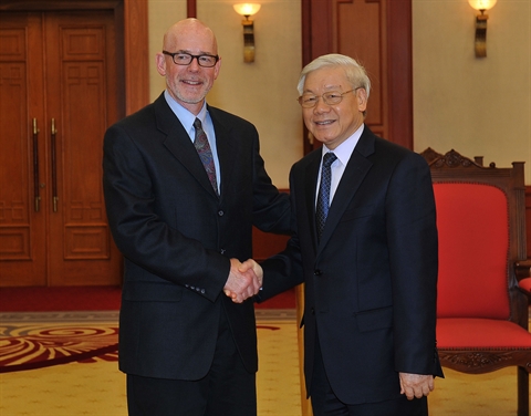 | Le président du Parti communiste des États-Unis John Bachtell (gauche) et le secrétaire général du PCV, Nguyên Phu Trong. |