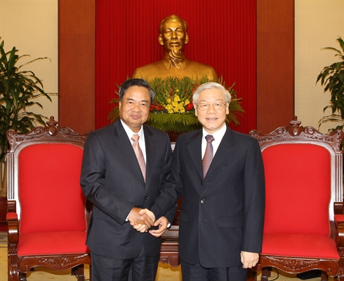 | Le secrétaire général du PCV Nguyên Phu Trong (droite) et le président de la Commission centrale de l'organisation du PPRL, Chansy Phosikham. |