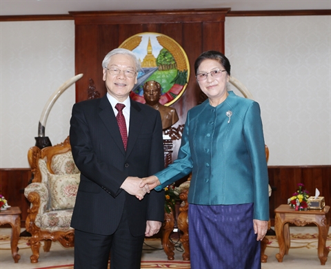 | Le secrétaire général Nguyên Phu Trong et la présidente de l’Assemblée nationale du Laos, Pany Yathotou, le 24 novembre à Vientiane. |