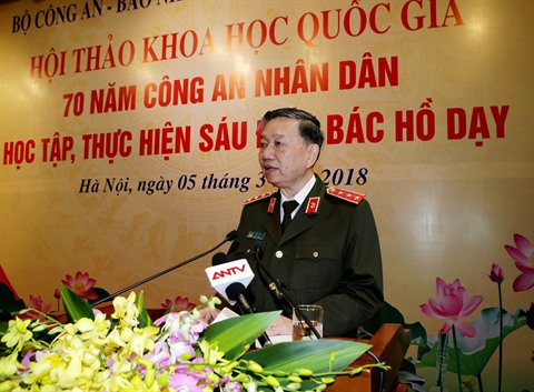 | Le ministre de la Police, Tô Lâm, lit la lettre envoyée par le secrétaire général du PC vietnamien, Nguyên Phu Trong, à un symposium à Hanoï. |