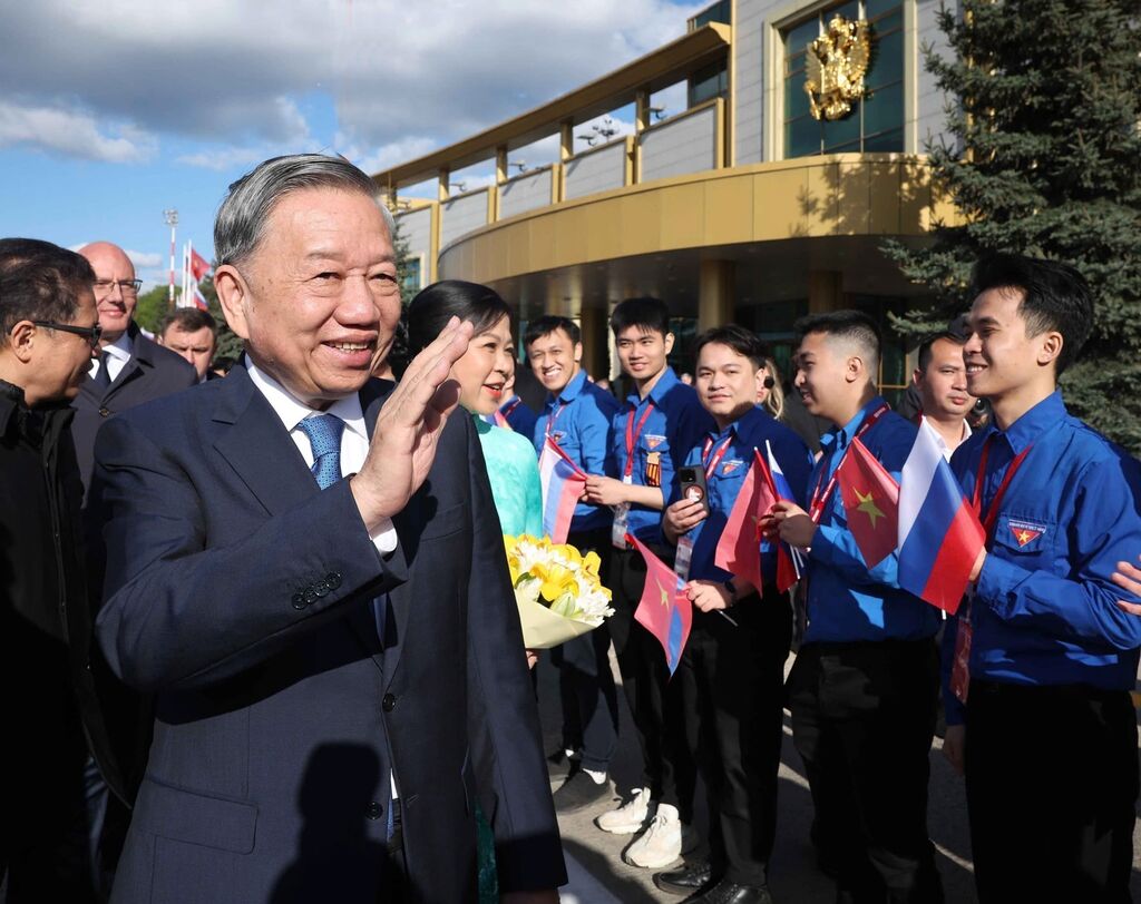 | Le secrétaire général du Parti, Tô Lâm, et son épouse sont salués par les étudiants vietnamiens en Russie. |