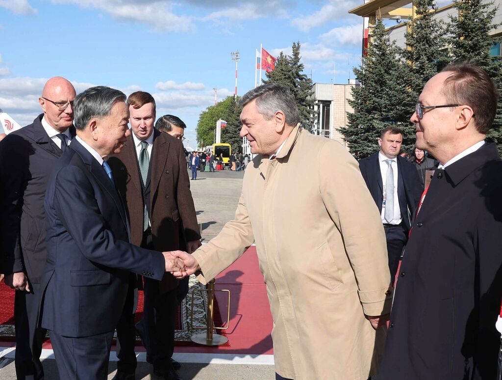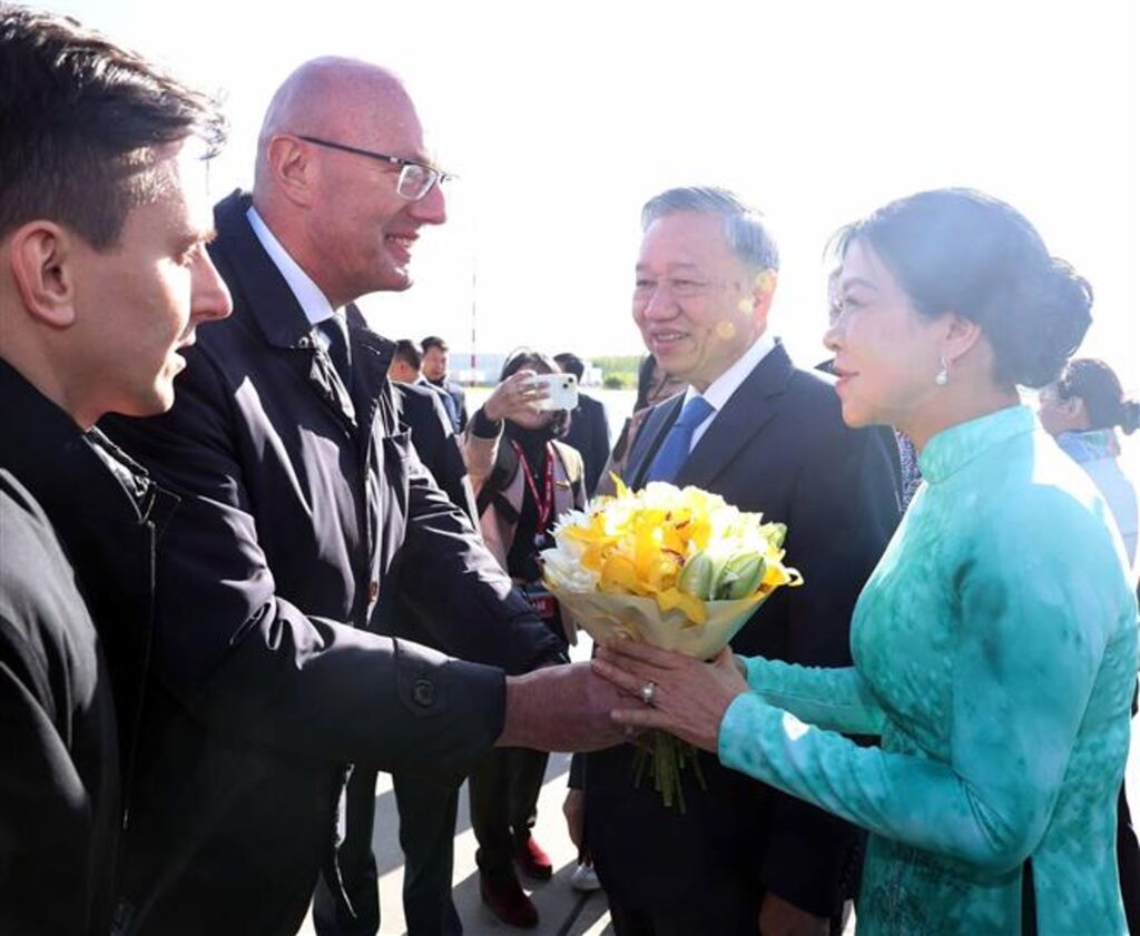 La cérémonie d'accueil officielle du secrétaire général du Parti, Tô Lâm, de son épouse ainsi que de la délégation vietnamienne de haut rang s'est déroulée solennellement à l'aéroport Vnukovo 2.