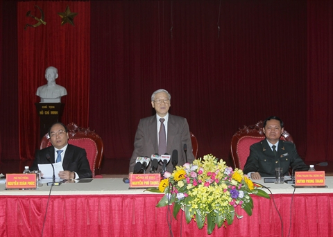 | Le secrétaire général du Parti communiste du Vietnam, Nguyên Phu Trong (centre), a eu une séance de travail avec l’Inspection gouvernementale, le 16 mars à Hanoi. |