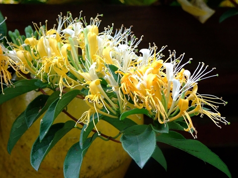Il s’agit d’un sous-arbrisseau grimpant à feuilles ovales caduques et tubulées jaune-orangé ou semi-persistantes jaune-blanc. Le chèvrefeuille est originaire de l’Europe méridionale et du Caucase, le Jin Yin Hua de Chine et du Japon. Cette espèce pousse à l’état sauvage sur les murs, les arbres et dans les haies et est souvent cultivée comme plante ornementale.