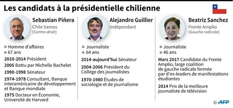 "L'histoire montrera que les bonnes décisions ont été prises", a lancé Alejandro Guillier, qui s'inscrit dans les pas de Mme Bachelet, laquelle quitte la présidence avec 23% d'opinions favorables. Sebastian Piñera, 67 ans, a déjà occupé le palais présidentiel de La Moneda de 2010 à 2014. Il n'avait pas pu se représenter dans la foulée, la loi chilienne interdisant deux mandats consécutifs.