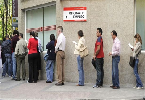 | Des personnes font la queue à l'entrée du bureau de chômage au centre de Madrid. |