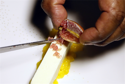 De ses belles mains chocolat, il détache le caviar du fruit et le dépose ensuite sur une crème chiboust mariée à un parfait glacé au citron vert, avec un trait de miel, avant de l’entourer d’un coulis à base de yuzu (un autre agrume à la mode).