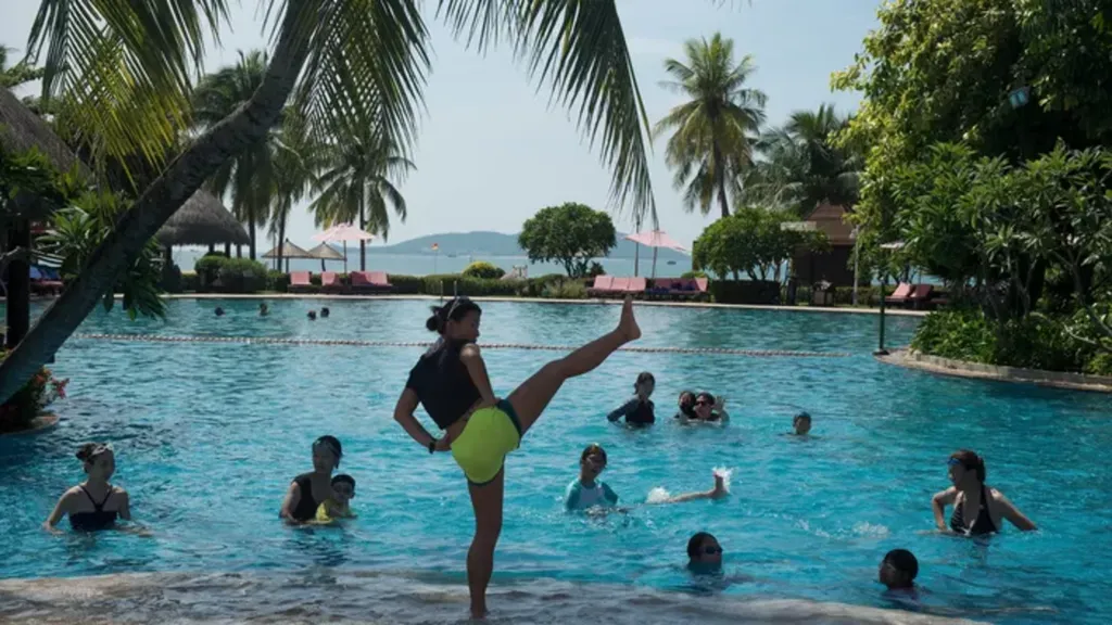 | Cours d'aquagym dans une piscine du complexe Club Med de Sanya. |