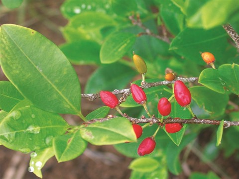 C’est un buisson à feuilles ovales, alternées et persistantes, à petites fleurs blanches et à petites baies rouges contenant une graine chacune.