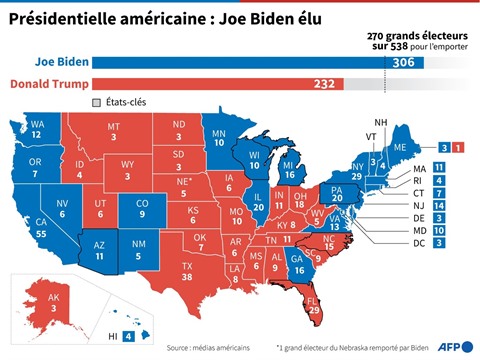 Là aussi, les résultats certifiés confirment l'avance confortable de Joe Biden, annoncée dès le 7 novembre par les grands médias américains, avec 306 grands électeurs contre 232 à Donald Trump.