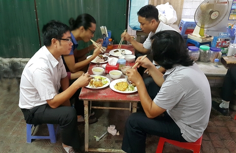 | À midi, les "com bui" dans les petites ruelles à proximité des bureaux de travail sont pris d’assaut par les fonctionnaires. |