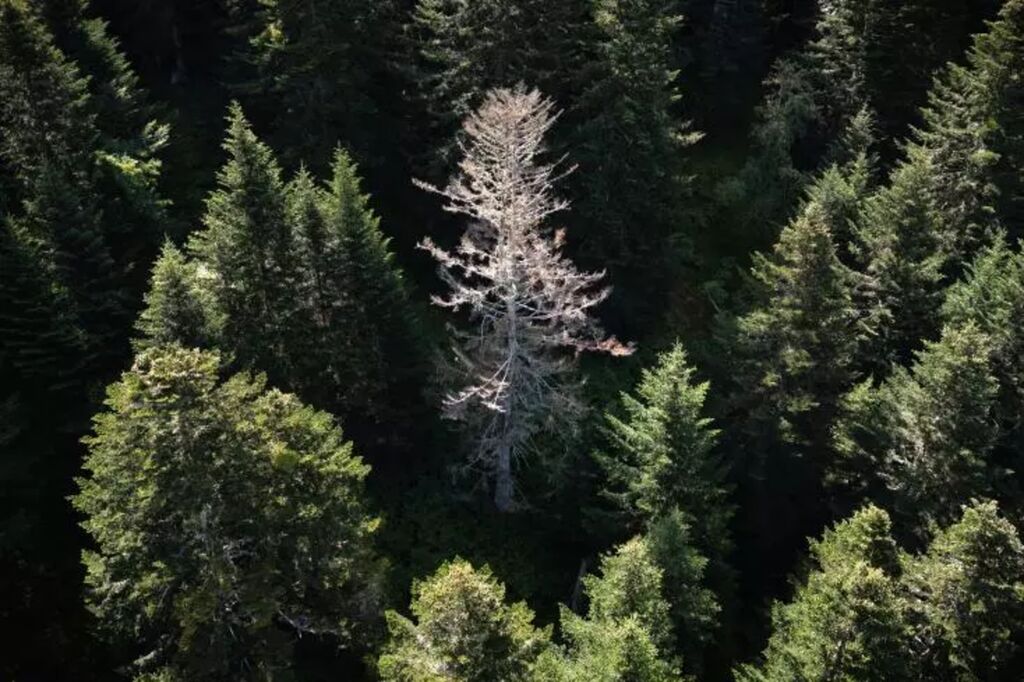| Un sapin mort dans la forêt pyrénéenne, le 30 juillet, à Boutx, en France. |