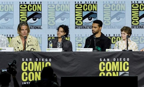 | De gauche à droite : Chris Pine, Michelle Rodriguez, Regé-Jean Page, et Sophia Lillis au Comic-Con à San Diego, le 21 juillet. |
