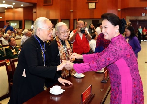 | La présidente de l'Assemblée nationale, Nguyên Thi Kim Ngân (droite), et des participants à la cérémonie de remise du titre de "Héros des forces armées populaires" le 19 décembre. |