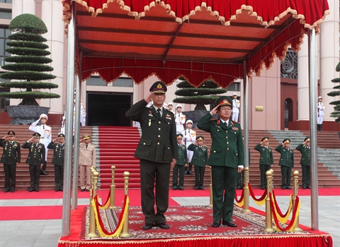 | Le général de corps d'armée Dô Ba Ty, chef d'État-major de l'Armée populaire du Vietnam (droite), et le général Worapong Sanganetra, commandant de la force de la défense de Thaïlande, le 21 avril à Hanoi. |