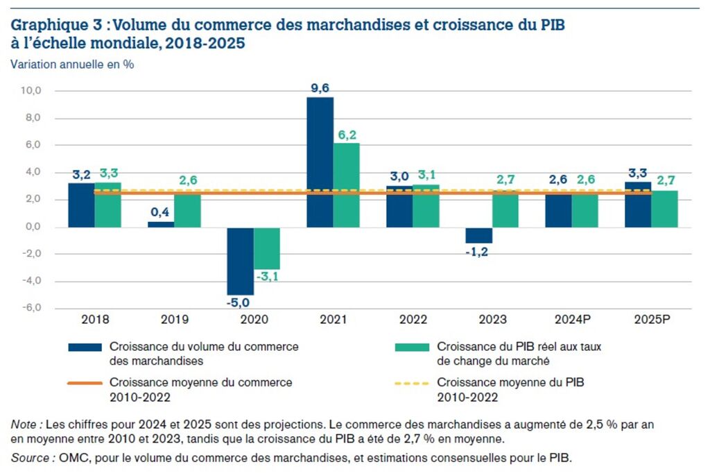 Selon l'OMC, le volume du commerce mondial de marchandises a diminué de 1,2% l'année dernière, mais augmentera de 3,3% en 2025.