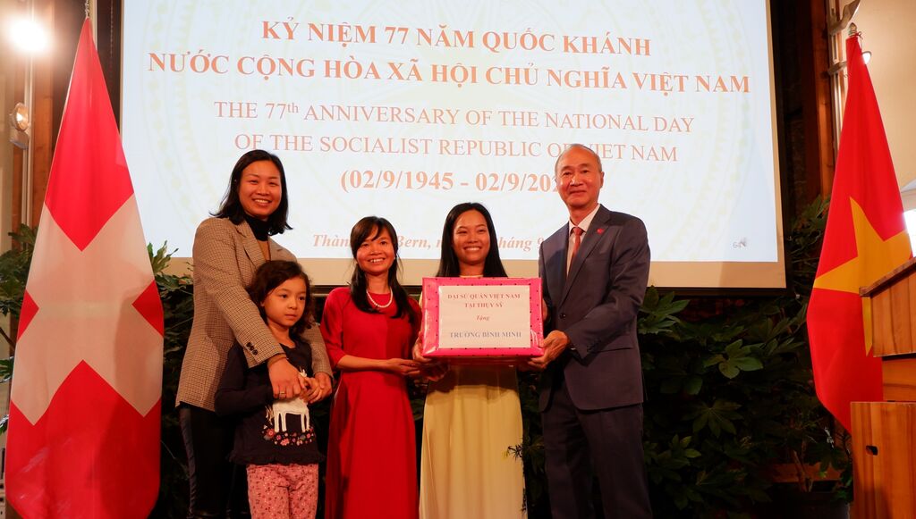 | L’ambassadeur du Vietnam en Suisse, Phùng Thê Long (droite) remet des cadeaux à l’école Binh Minh qui est construite pour préserver la culture et la langue vietnamiennes au sein de la communauté vietnamienne en Suisse. |