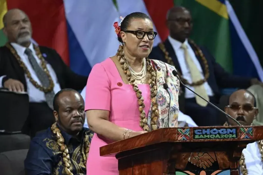 | La secrétaire générale du Commonwealth Patricia Scotland s'exprime devant le sommet des chefs d'État et de gouvernements de l'organisation à Apia, aux Samoa, le 25 octobre. |