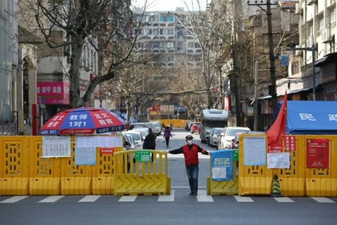 | Un homme devant une barrière empêchant l'enrée dans un quartier confiné de Wuhan, le 15 mars |