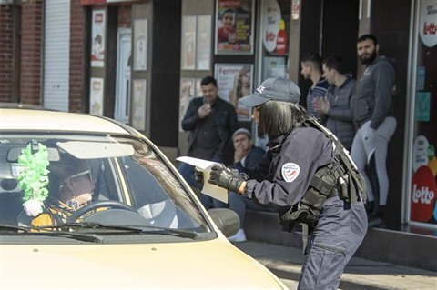 | Une policière française contrôle un véhicule à Wattrelos, à la frontière franco-belge, le 18 mars. |