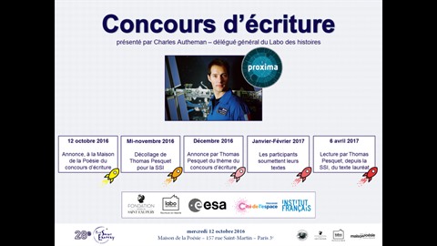 Dans son journal de bord, celui qui est le 10e français affecté à un vol dans l’espace a indiqué avoir pris dans sa valise les œuvres complètes d’Antoine de Saint-Exupéry. En s’appuyant sur l’attachement que l’astronaute Thomas Pesquet porte pour les valeurs humanistes du célèbre écrivain-aviateur français, le Labo des histoires, la Fondation Antoine de Saint-Exupéry pour la Jeunesse (FASEJ), l’Agence Spatiale Européenne (ESA), la Cité de l’Espace et l’Institut Français ont imaginé un concours d’écriture.