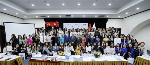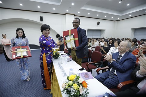 | Le vice-directeur général de la VNA, Lê Quôc Minh (droite), et le représentant du BRAP-OIF, Chékou Oussouman, remettent des prix à Man Khanh Ly, lauréate du premier prix. |