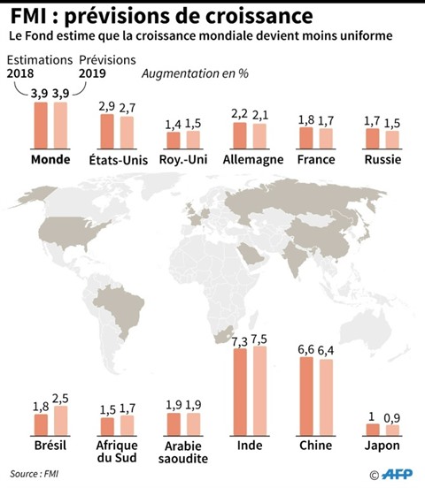 La prévision mondiale du FMI, également inchangée pour 2019 (3,9%) par rapport aux prévisions de printemps, cache de grandes disparités puisque le Fonds a abaissé celle des pays avancés dont le Japon, l'Allemagne, la France, l'Italie et le Royaume-Uni.